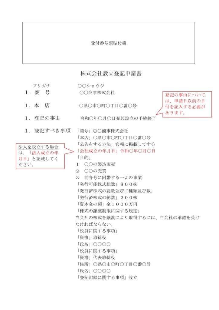 なお、登記の年月日は、登記すべき事項の「会社成立の年月日」に記載した日付のとおりとすることを求めます(法人の場合は「法人成立の年月日」)。