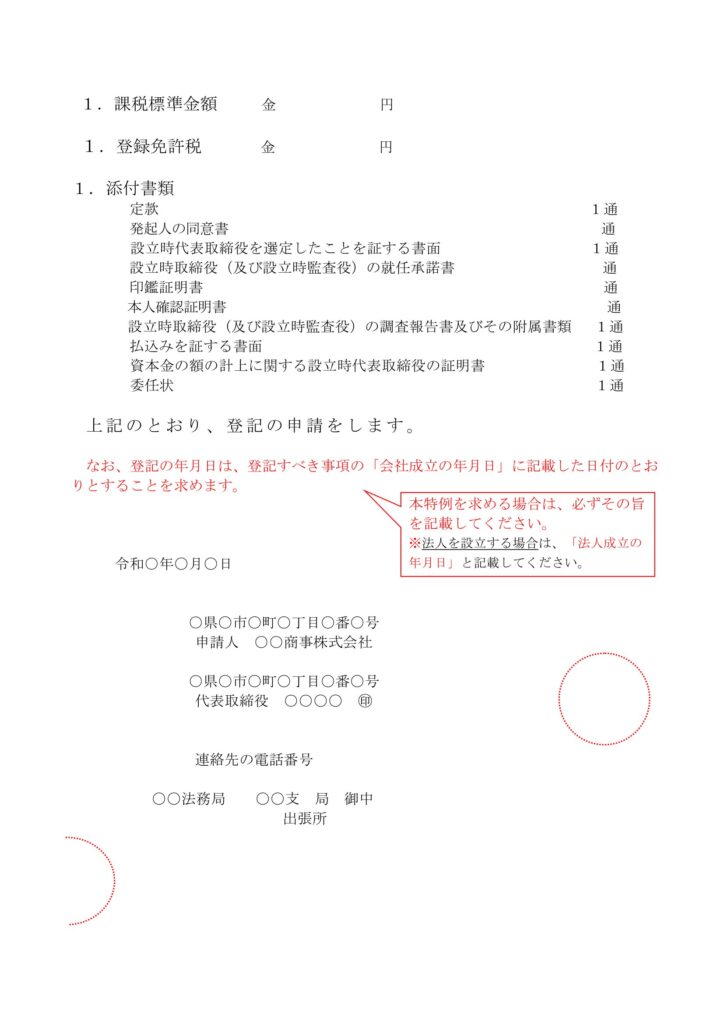・設立の登記の際に本特例を求める旨及びその求める登記の日(以下「指定登記日」といいます。)を申請書に記載すること。